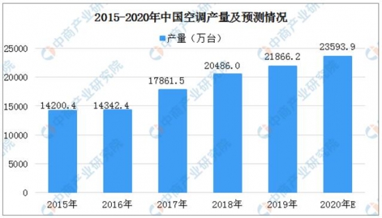 據(jù)國家統(tǒng)計(jì)局?jǐn)?shù)據(jù)顯示:2019年我國空調(diào)總產(chǎn)量為21866.2萬臺(tái),相比2018年提升6.74%。據(jù)中商產(chǎn)業(yè)研究院預(yù)測,2020年我國空調(diào)總產(chǎn)量將達(dá)23593.9萬臺(tái)。