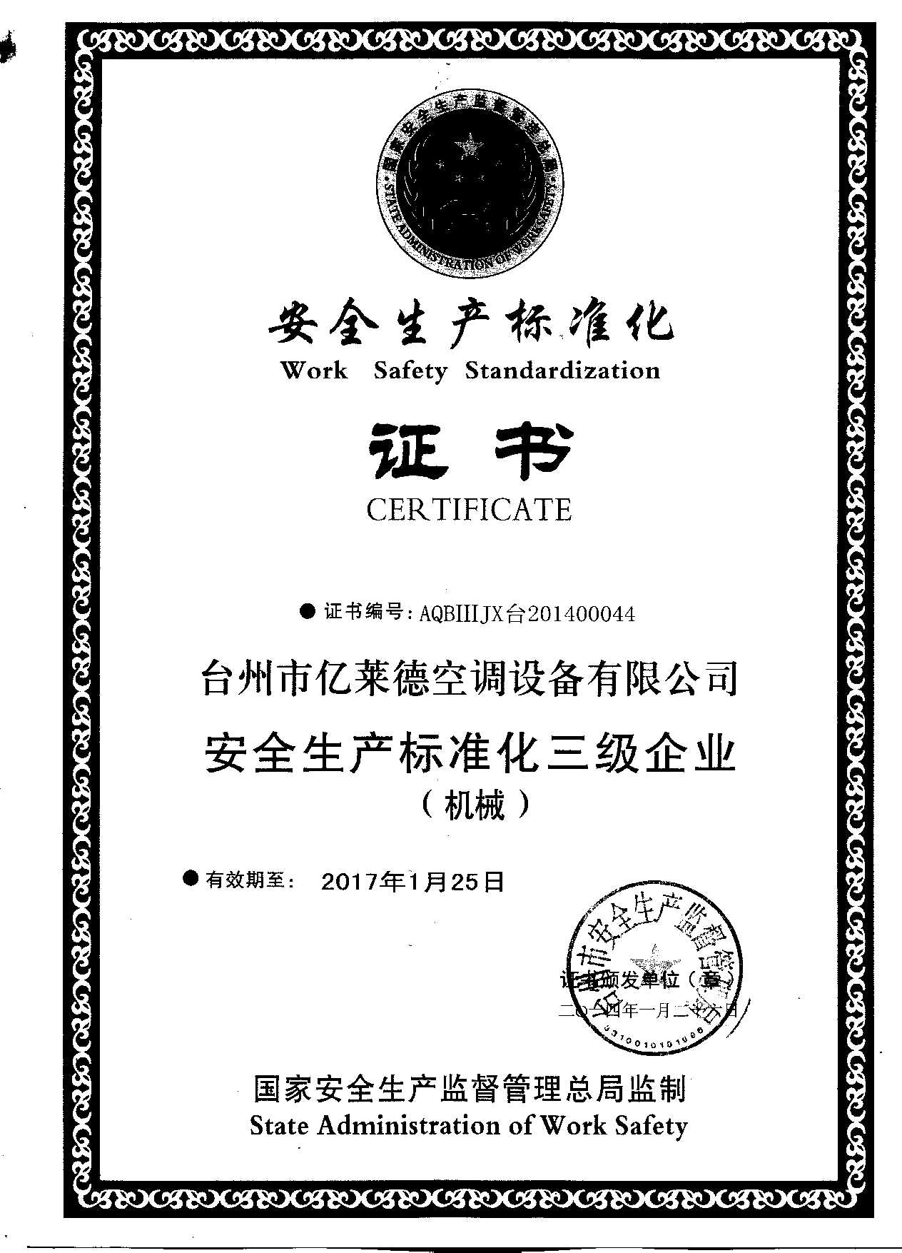 安全生產(chǎn)標(biāo)準(zhǔn)化證書