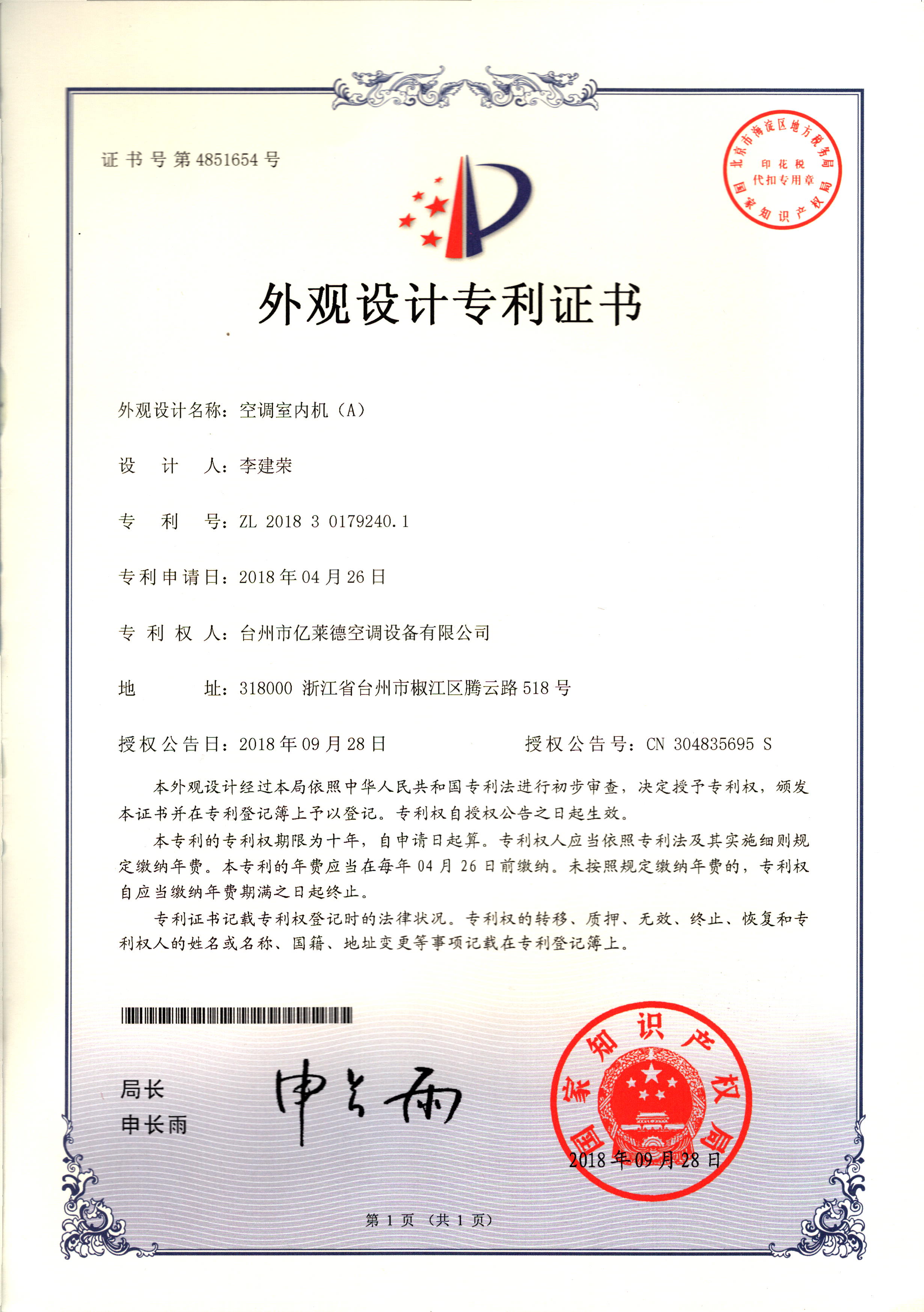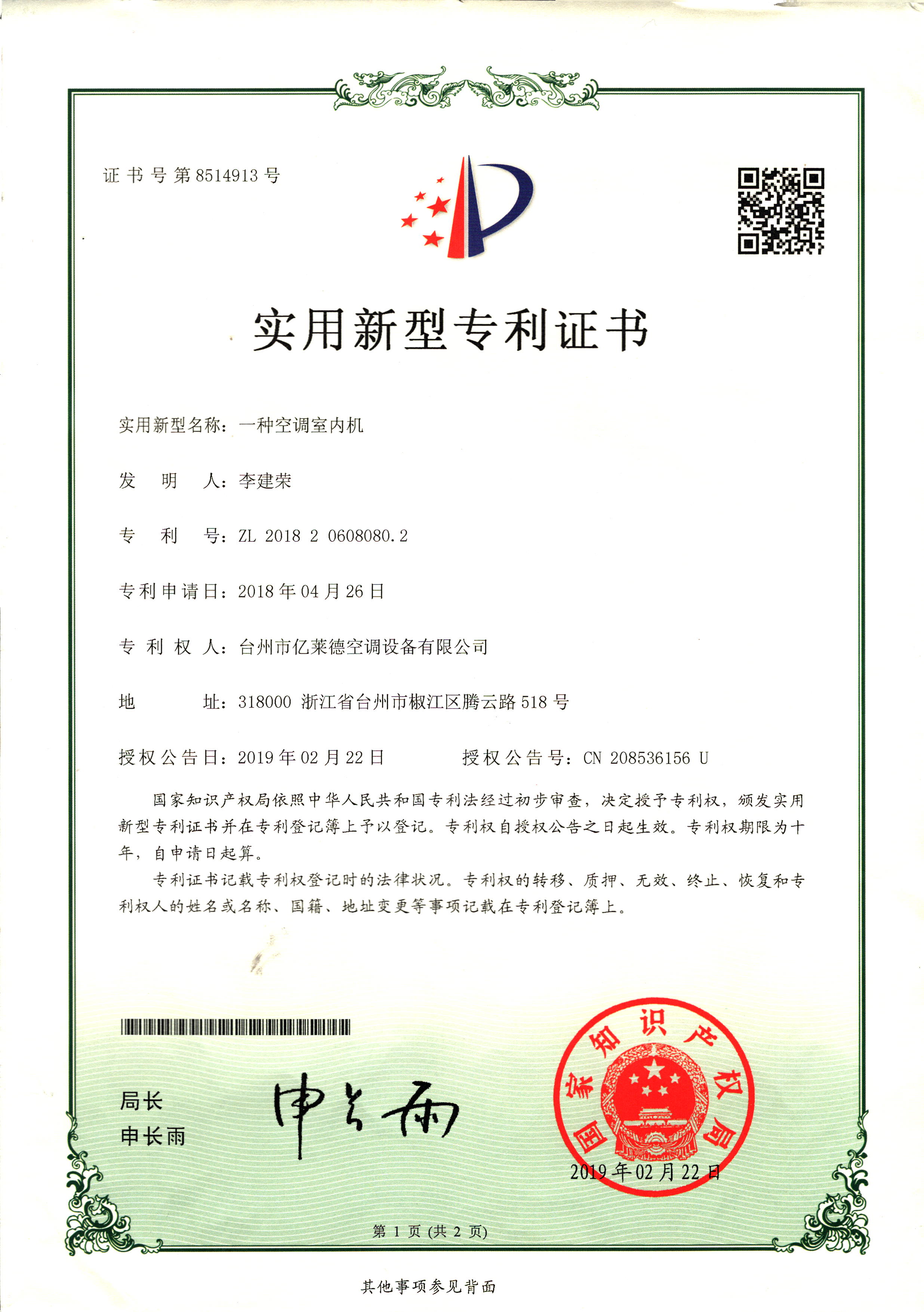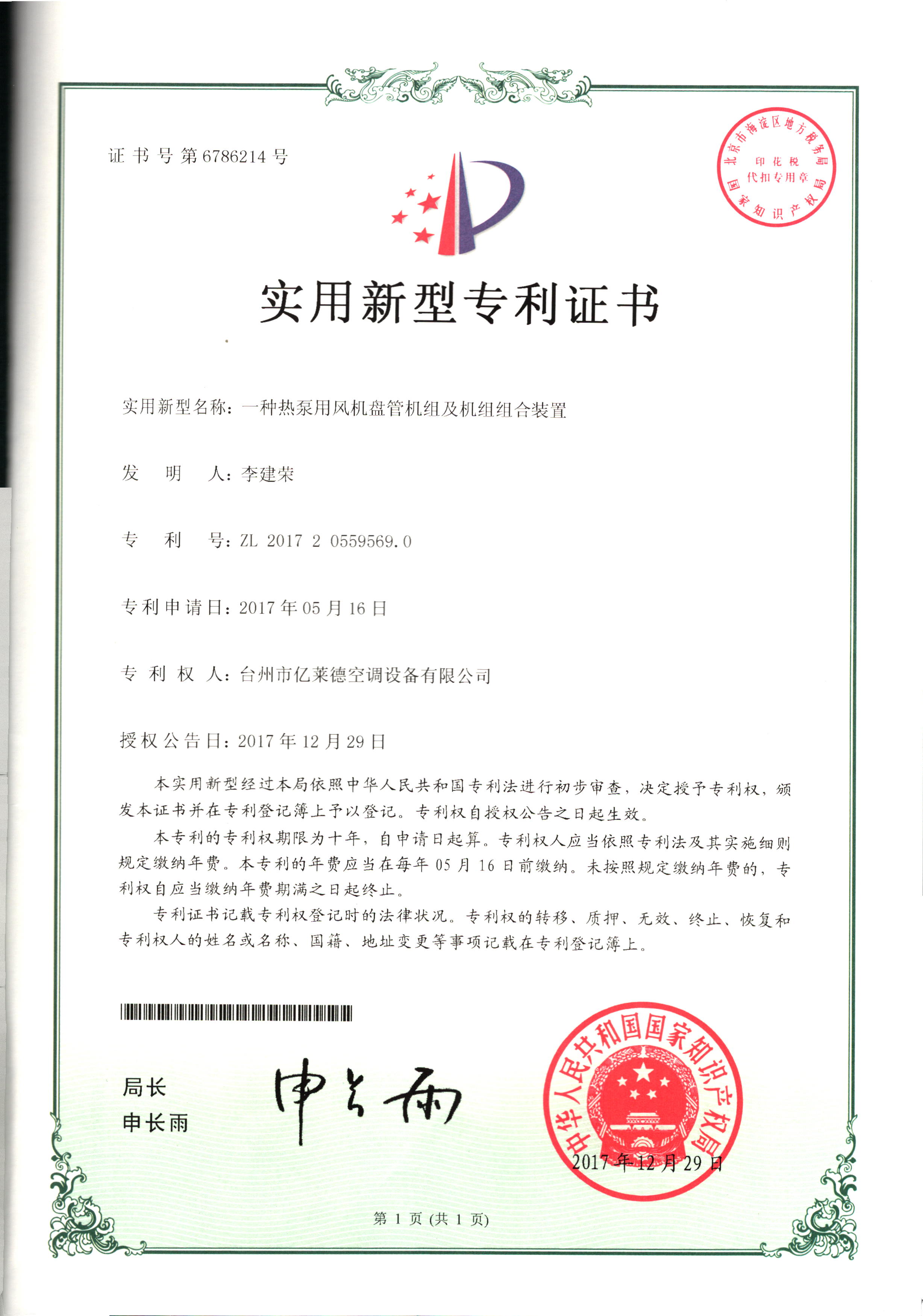 實(shí)用新型專利證書--一種室內(nèi)冷暖...