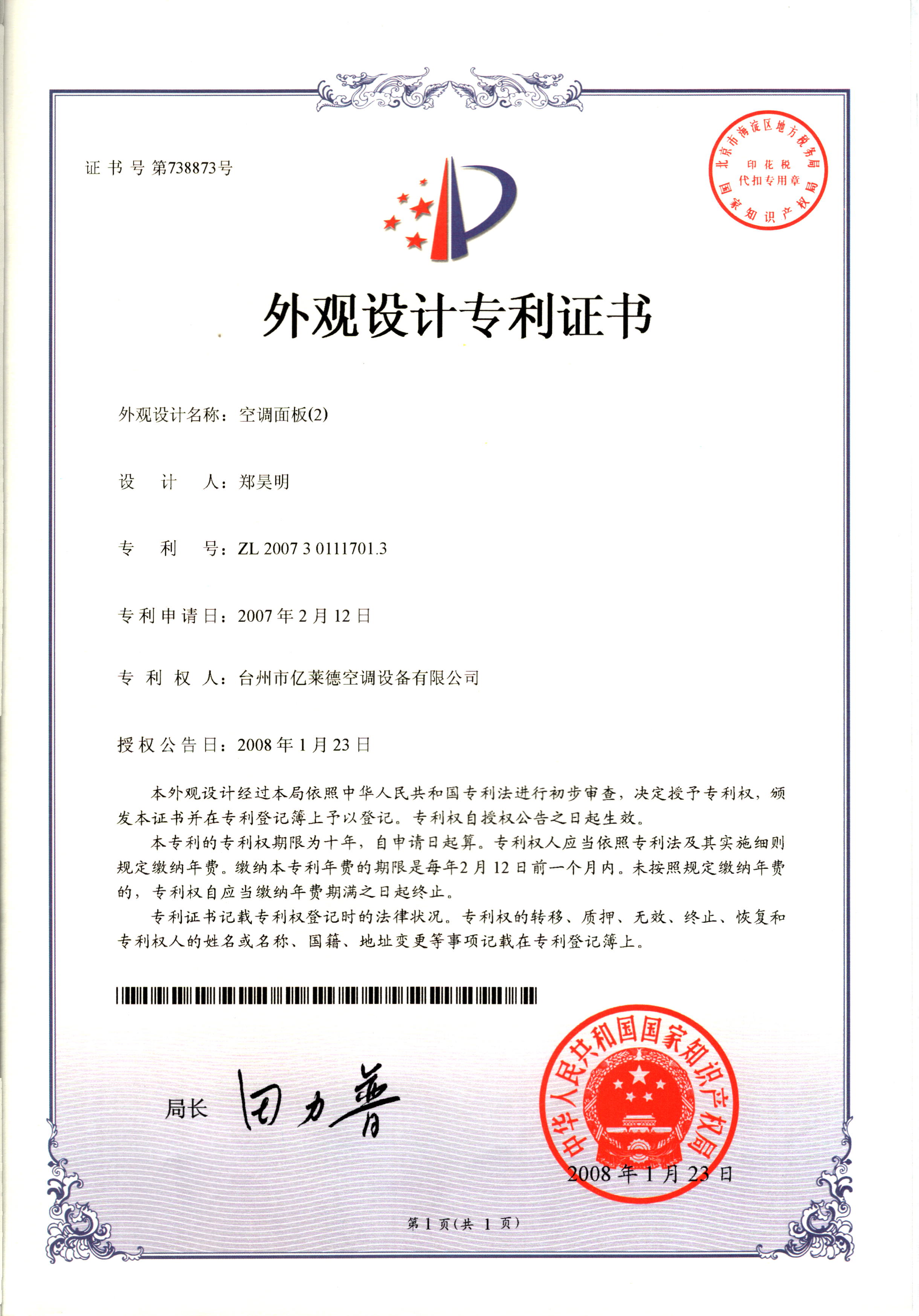 外觀設(shè)計(jì)專利證書--空調(diào)面板(2)