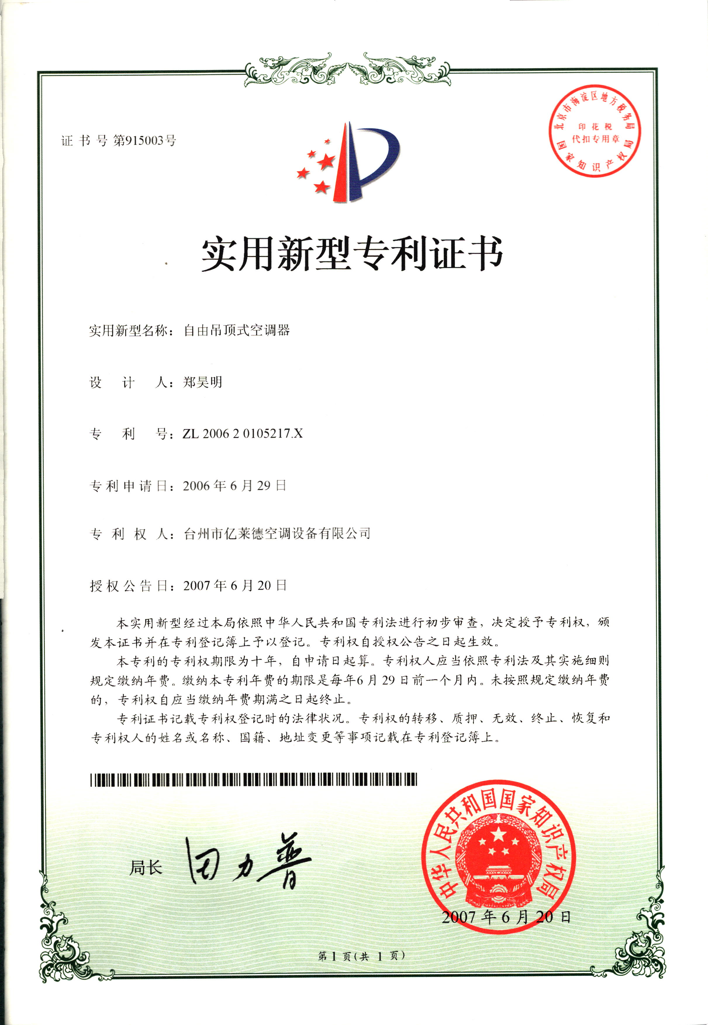 實(shí)用新型專利證書--自由吊頂式空...