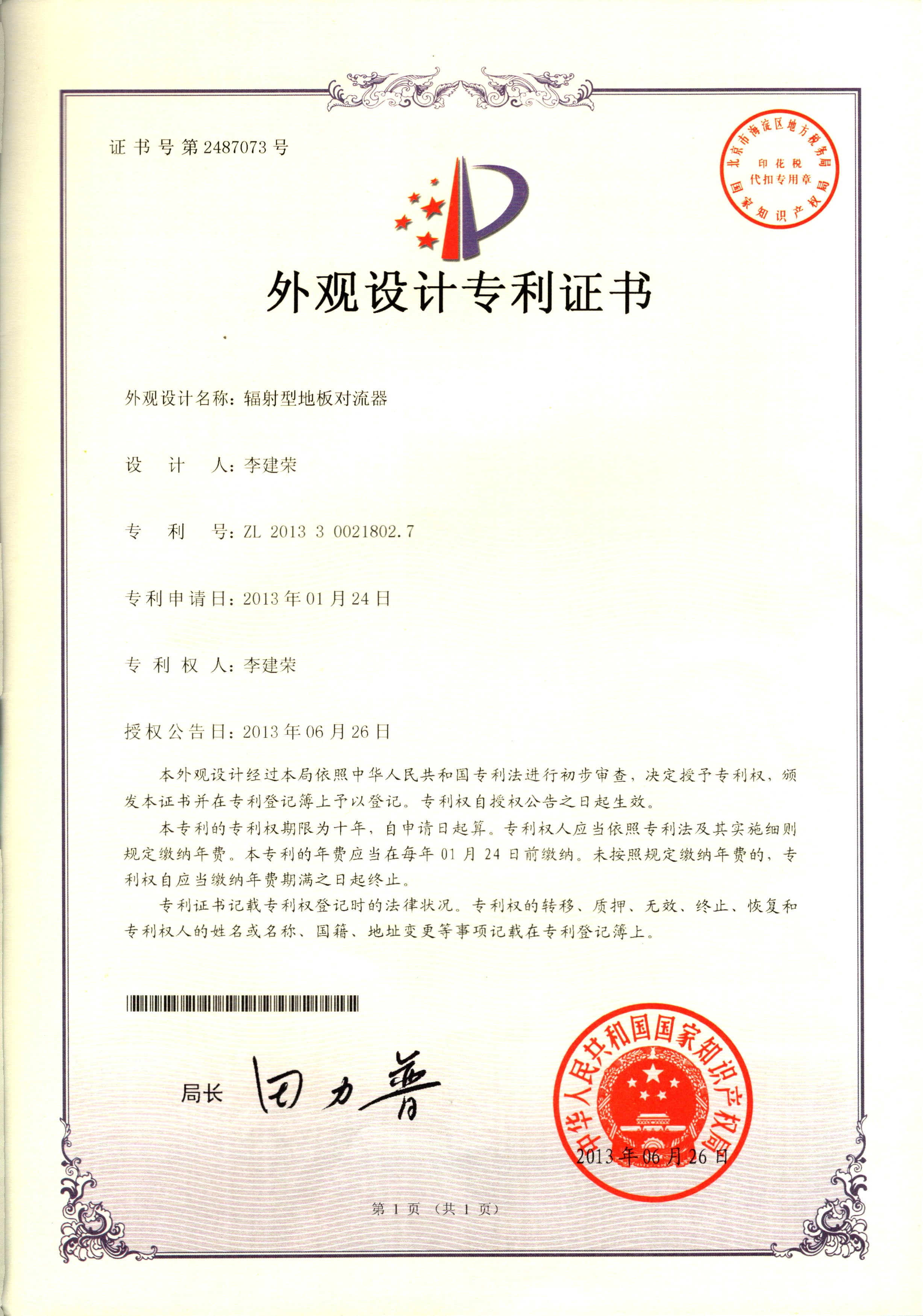 外觀設(shè)計(jì)專利證書--輻射型地板對...