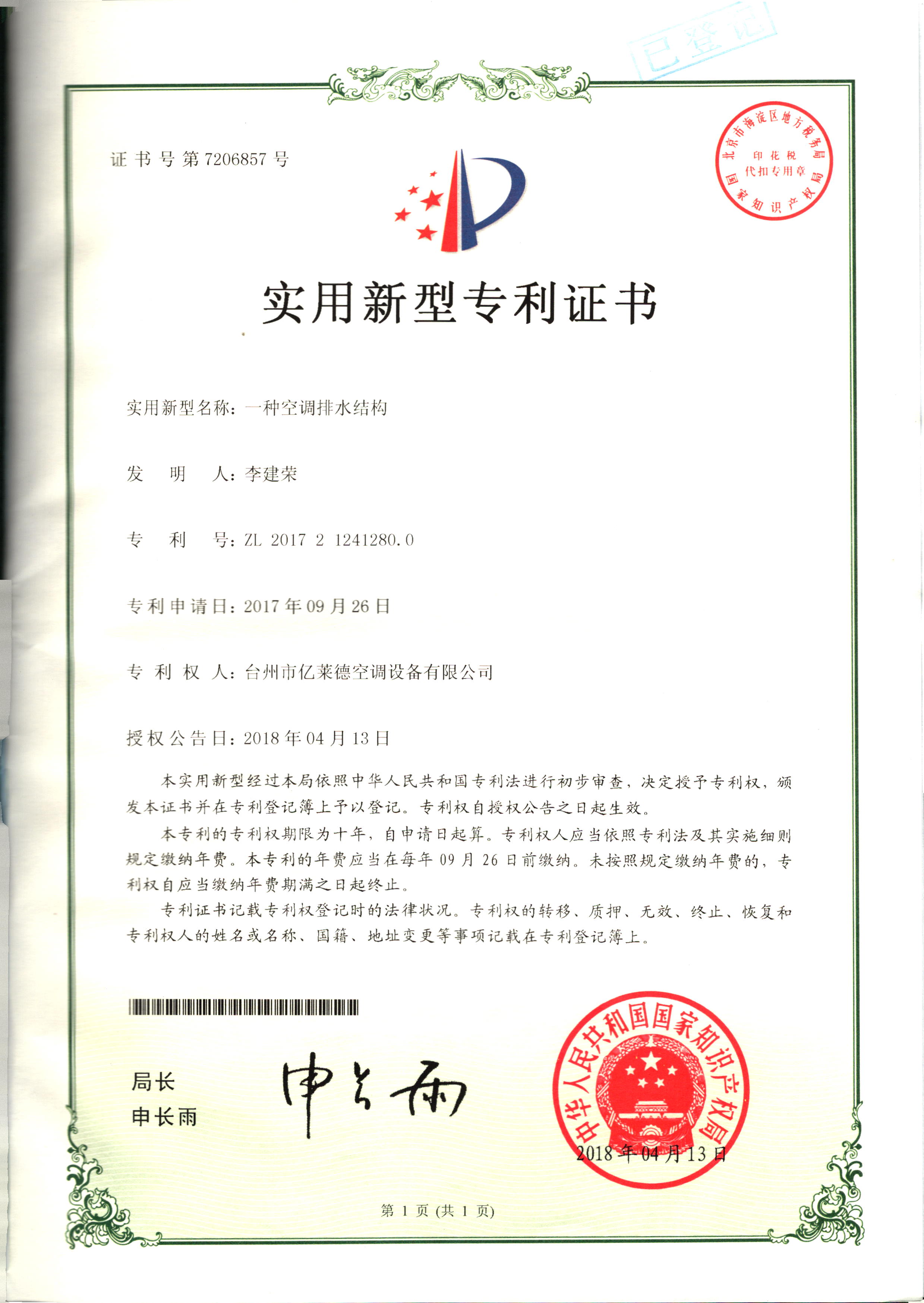 實(shí)用新型專利證書--一種空調(diào)防水...