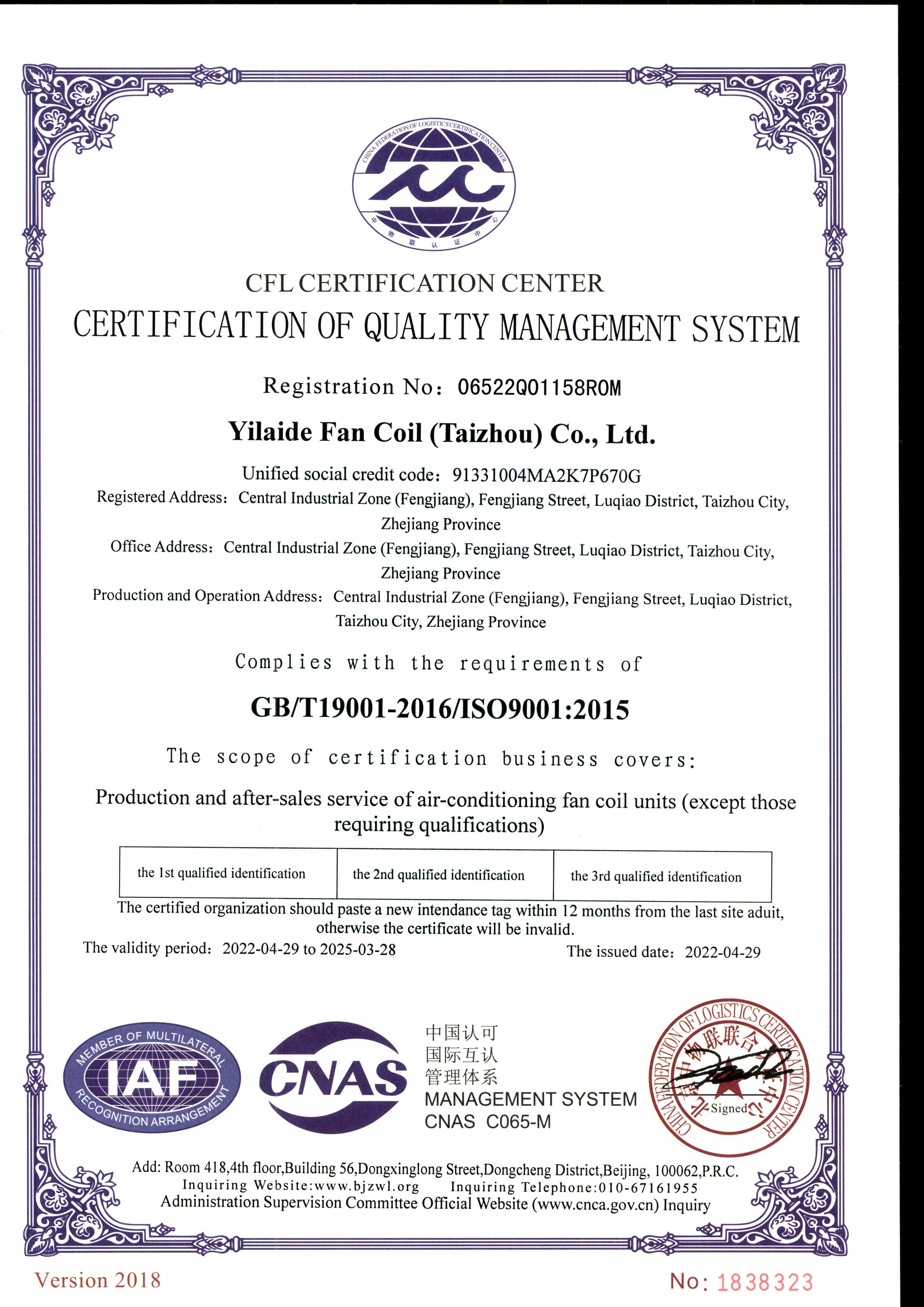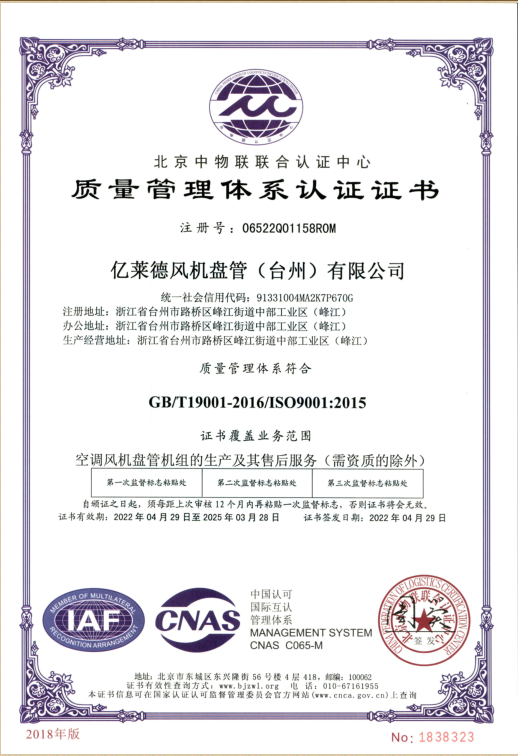 9001質(zhì)量體系認(rèn)證證書