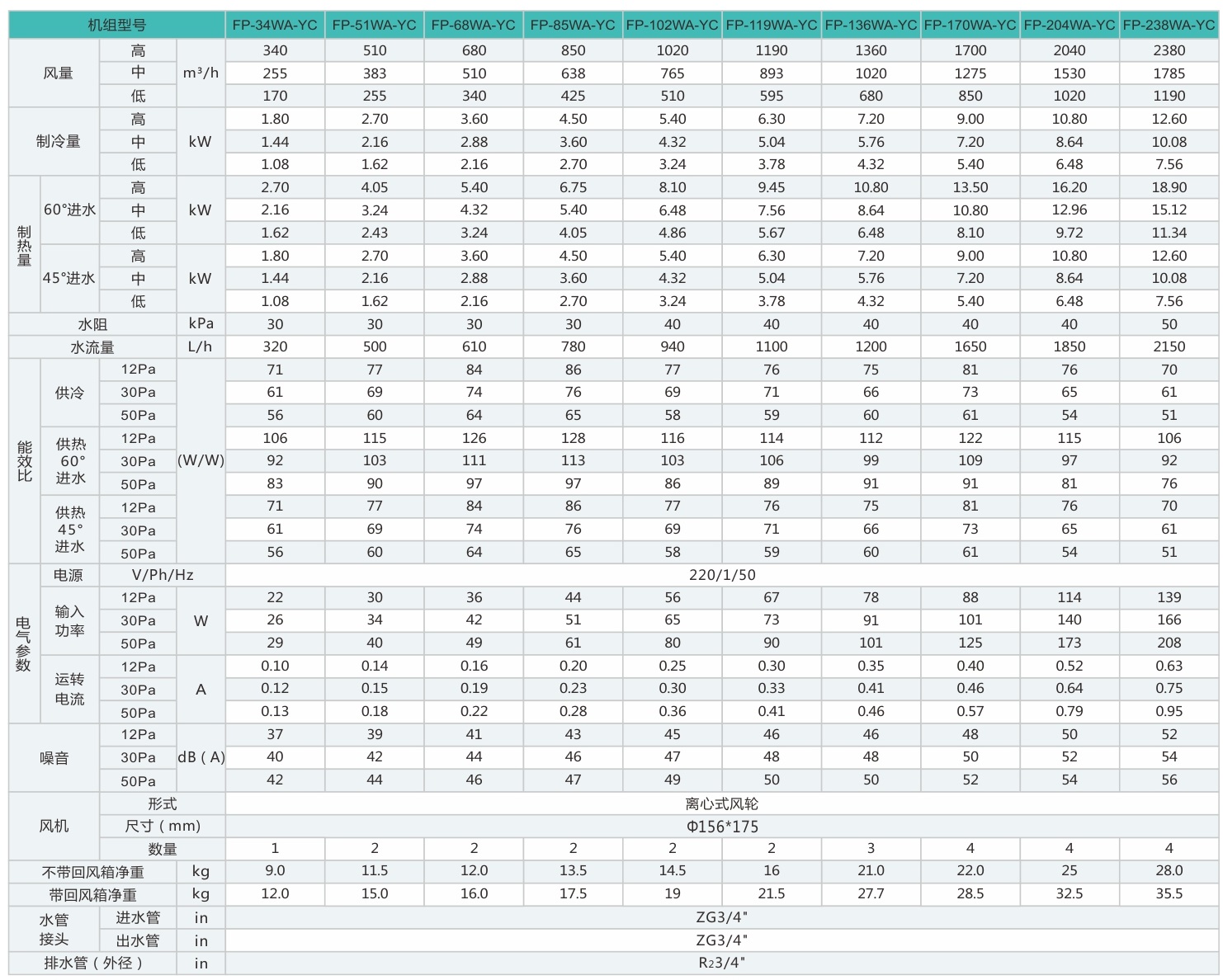 表中機組性能參數(shù)均在220V~/50Hz電源測試下所得。