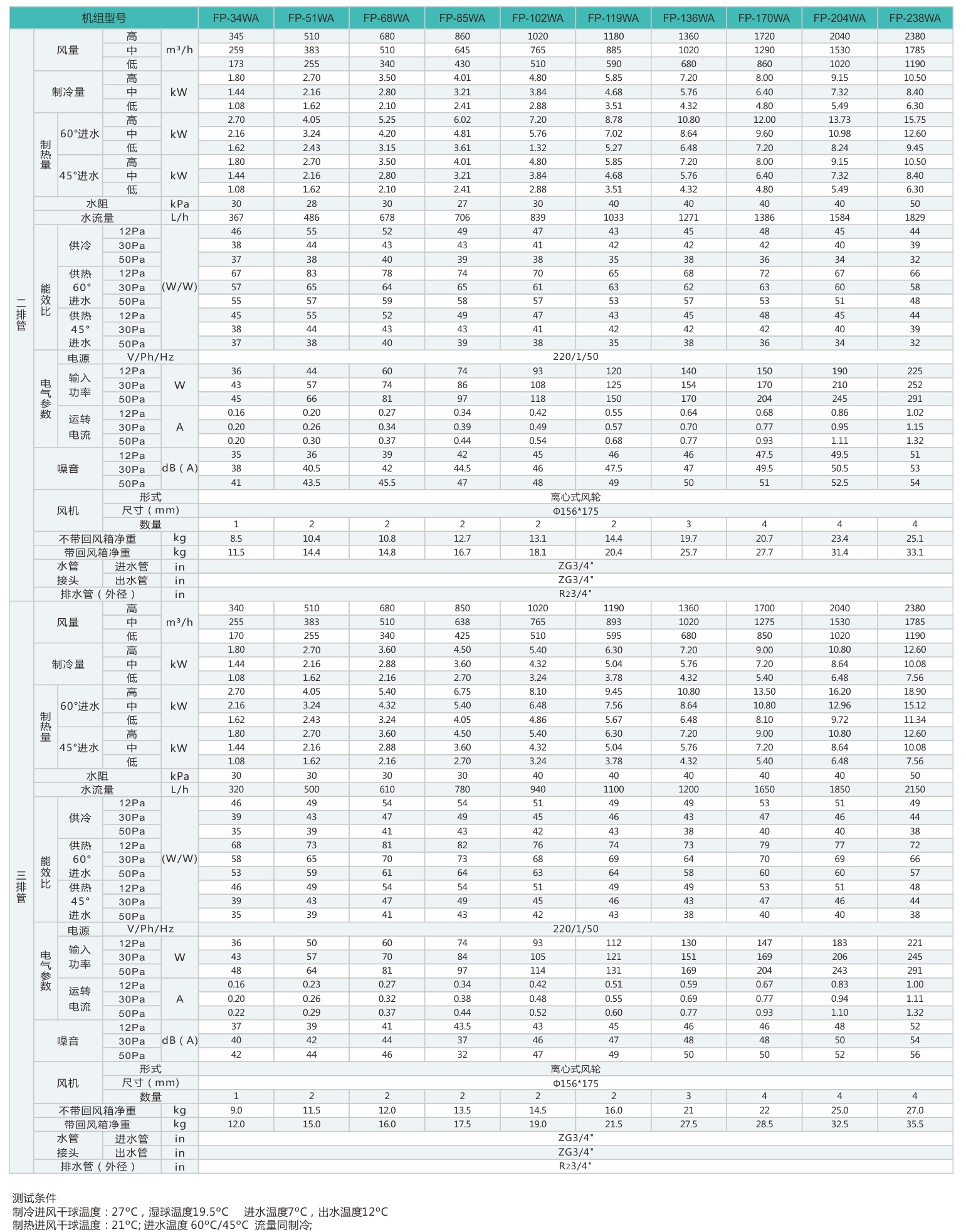 供冷量是在進風(fēng)干球溫度27℃,濕度溫度19.5℃,進水溫度7℃,出水溫度12℃條件下測試所得。